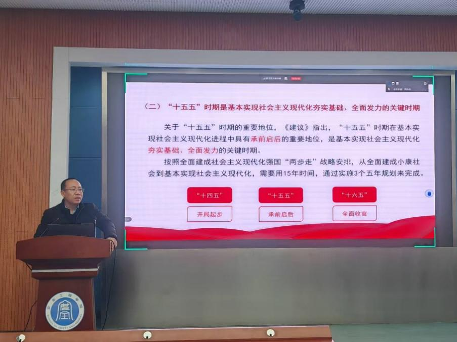 活动中,刘宏老师与杨腾锐结合自身工作实际,先后分享了第三次集中大课的学习心得。随后,刘应科以“深入学习贯彻党的二十届四中全会精神”为主题,为全体党员讲授专题党课。系统解读了“十五五”时期经济社会发展面临的形势、目标任务与重大原则,重点围绕高质量发展、科技自立自强、全面深化改革、统筹发展和安全等关键议题,阐述了坚持和加强党的全面领导对推进中国式现代化的重要意义,引导全体党员深刻认识“十五五”时期在社会主义现代化进程中的关键地位。