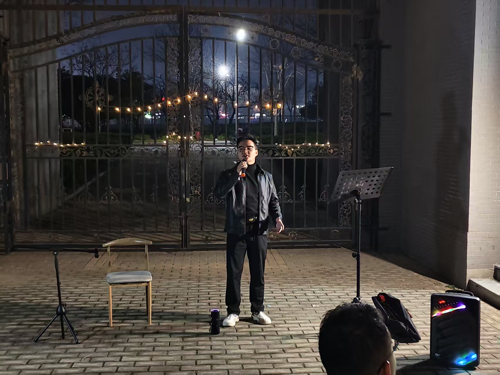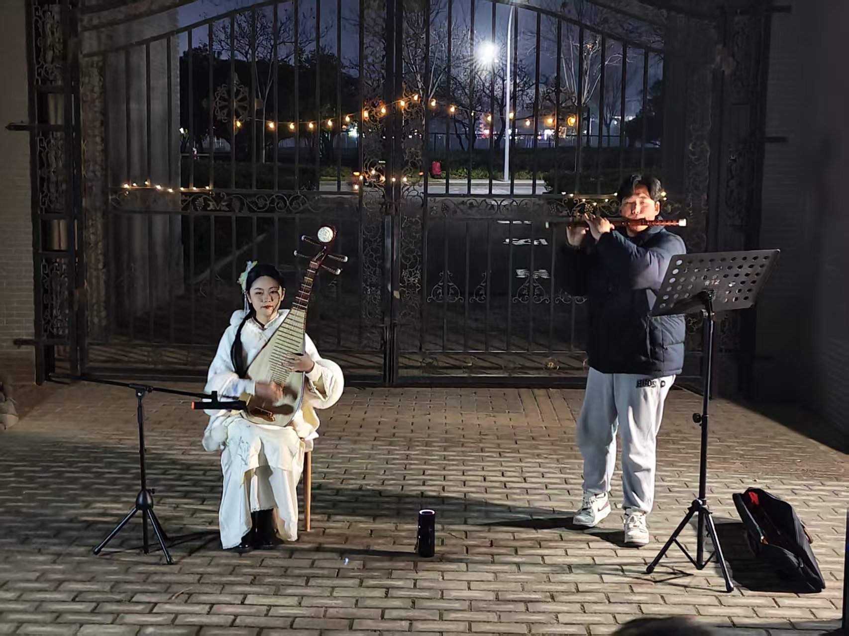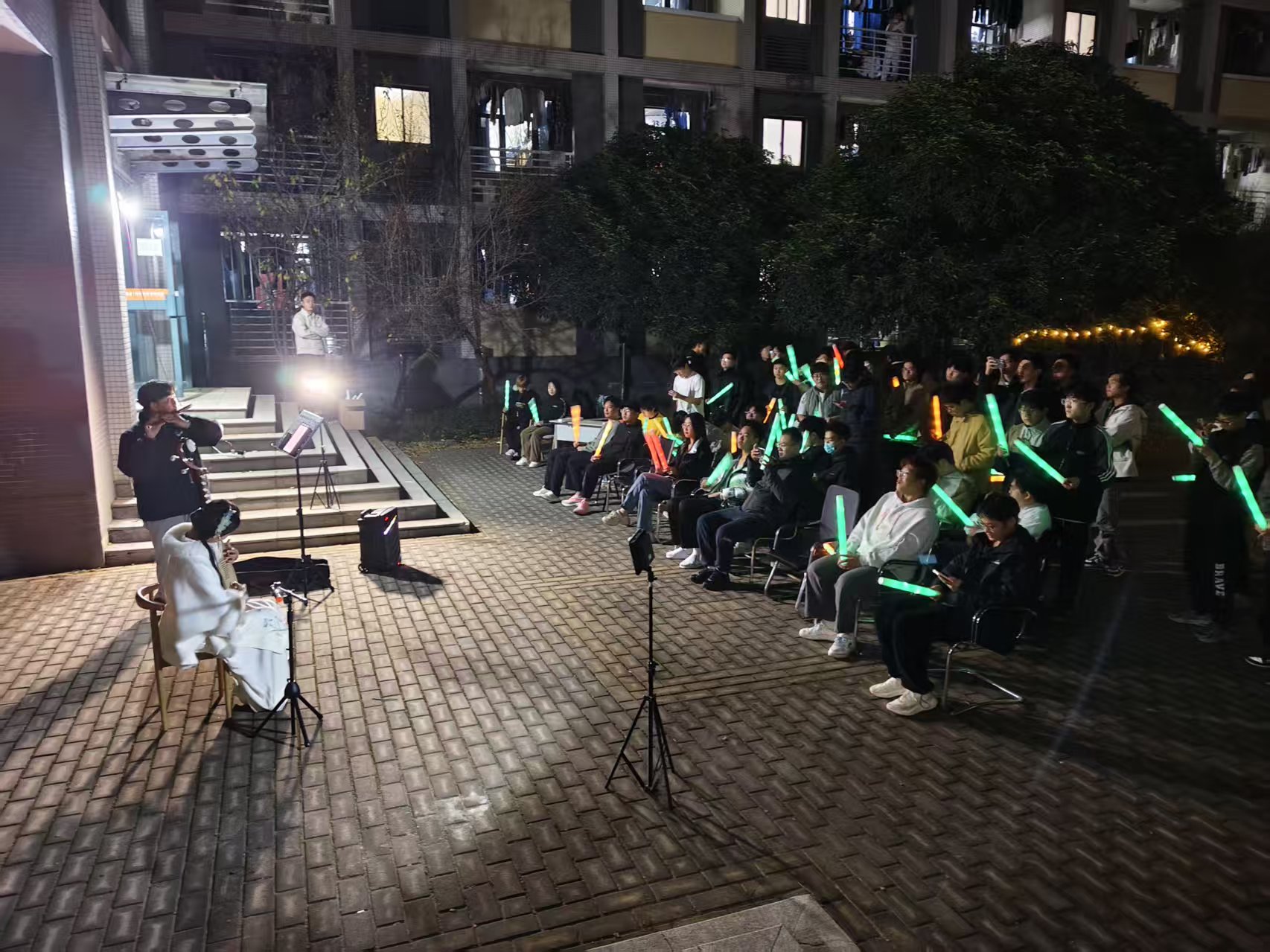 师生共同步入天井,享受这场音乐盛宴。王若来婉转低回的琵琶与范梦阳清越的笛声交织相和,流淌于青瓦月色之间,令听众凝神静赏。中场时分,迪力夏提一曲《启航》唱出了对家国的祝愿与对同窗的期许,引发观众强烈共鸣。师生自发跟唱,温暖的合唱声萦绕不绝,将现场气氛推向顶点。
