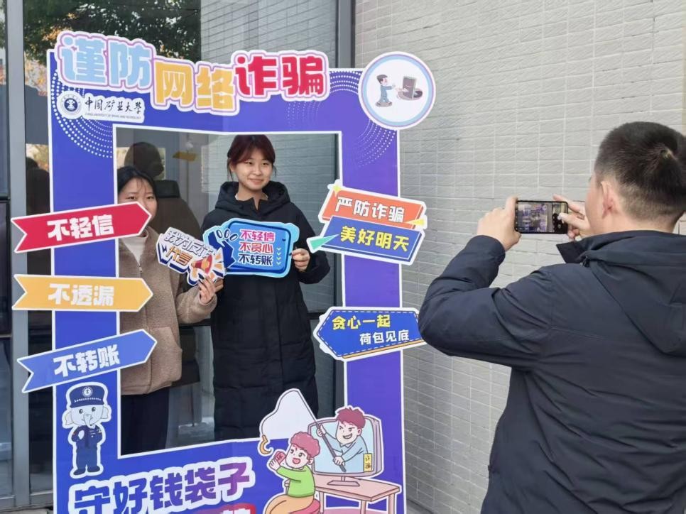 现场设置“反诈科普”“反诈能力测试”“玩套圈·防圈套”“反诈沙包大作战”等多个互动区域。在“反诈沙包大作战”区,学生通过投掷沙包识别诈骗关键词,在游戏中加深对诈骗手法的认知;“反诈科普”展板前,志愿者为同学们讲解常见诈骗类型与防范技巧;趣味拍照框吸引不少同学打卡留念,大家手持“不轻信、不转账”等宣传板合影,在轻松氛围中传递反诈理念。活动还为参与者准备了反诈主题文创纪念品,延伸宣传效果,融入日常生活。