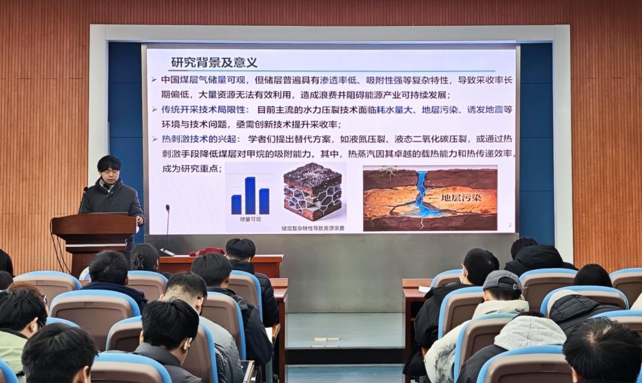 论坛聚焦安全工程前沿研究方向,三位主讲人依次开展学术分享。刘淳元以锂电池火灾防控为核心,分享“泄爆面积与形状对锂电池热失控气体爆炸特性影响研究”成果,详解灾害防治关键技术与实验进展,为新能源安全提供重要理论支撑;骆宇晨围绕职业健康与粉尘治理,结合工程实践与模拟分析,探讨了工业环境中粉尘控制技术的优化路径;邱浩深耕煤层气高效开采与热能利用领域,分享“高温热蒸汽强化煤层气开采及其润湿特性的实验与分子动力学研究”成果,揭示煤体结构演化与气体运移规律,为能源安全开发提供新视角。报告后,嘉宾与同学围绕科研方法、实验设计、成果转化等话题深入交流,共享科研心得。