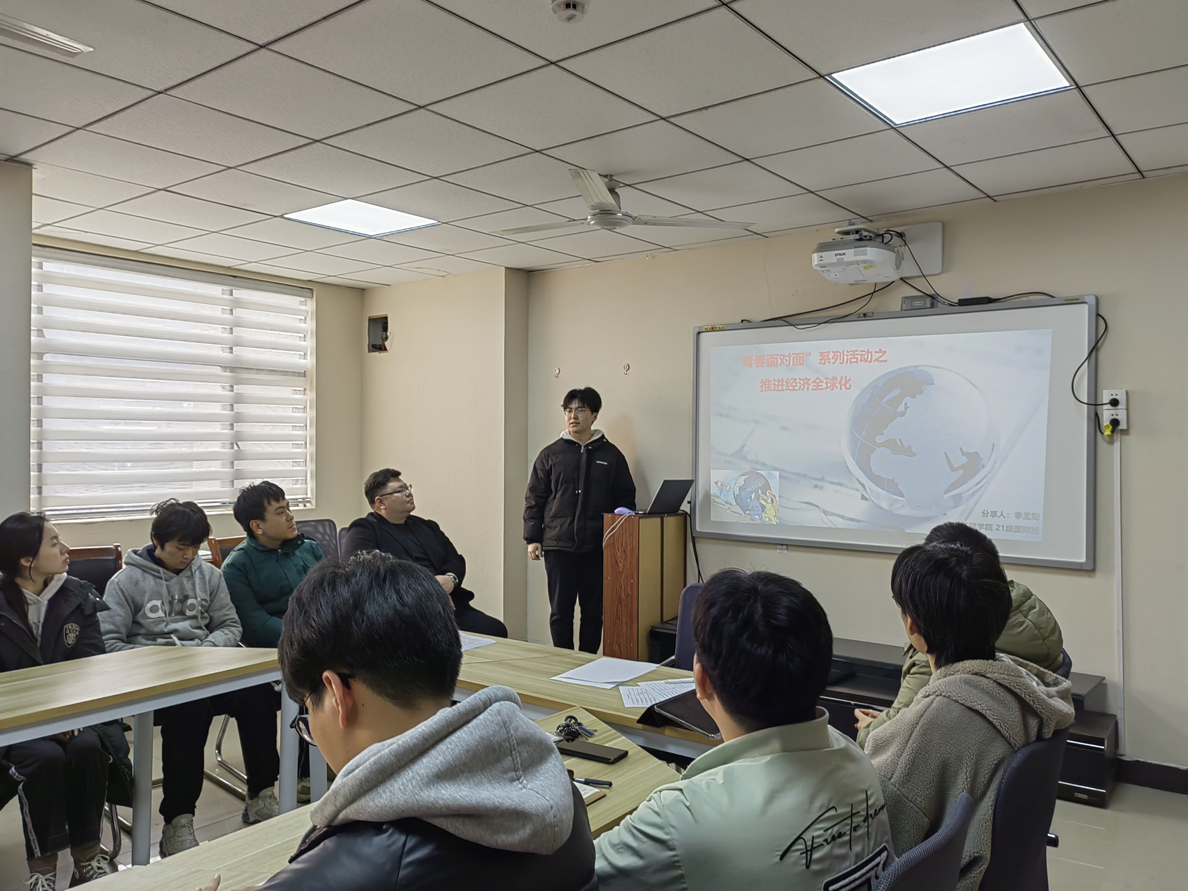 活动伊始,李孟阳同学结合有趣的小故事和科普视频,深入浅出地介绍了经济全球化的定义、历史背景以及给人们带来的便利。他认为,经济全球化是一把双刃剑,作为青年大学生我们要培养爱国主义情怀、沟通意识和实践调研能力。刘世通老师鼓励同学们要树立远大志向,学习知识既要广博又要精深,既要扎根祖国能源行业发展,又要放眼世界拓展思维,不断培养自身跨文化的意识和能力。