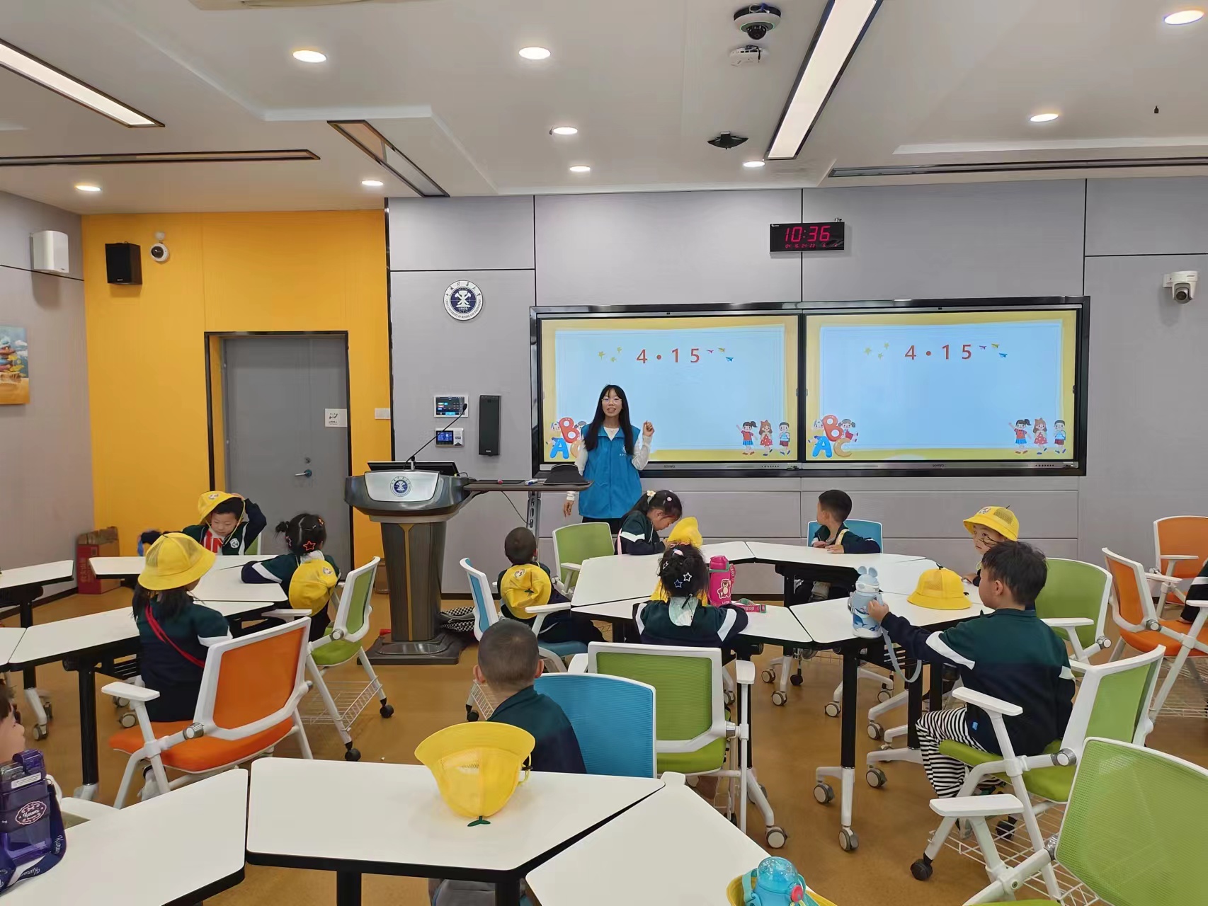早上八点二十分,我院学生志愿者、相关工作人员及游学的小朋友们在东门集合。集合完毕后,我院学生带领他们前往鹿苑和不显山参观,领略自然之美和动物的灵性。接着,幼儿园的小朋友们跟随着我院志愿者的步伐来到五号博学楼旁的大草坪做游戏,同时小朋友们分成两组,依次前往五号博学楼的智慧教室听课,通过志愿者们的讲述,幼儿园小朋友了解了教育日的概述、何为国家安全和如何保护国家安全。活动结束,志愿者与小朋友们进行了合影留念。