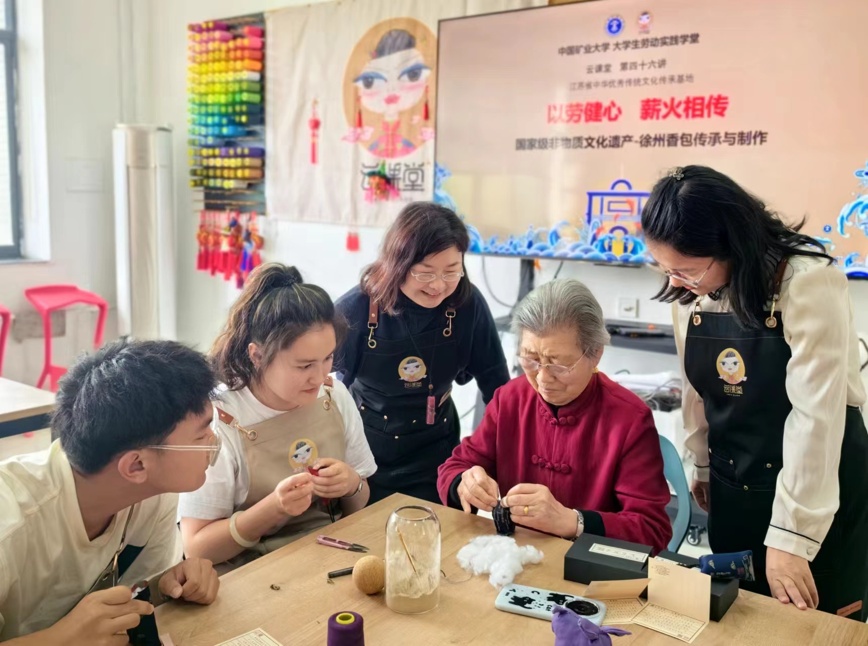 活动分为非遗制作和主题摄影两个阶段。在非遗文化体验环节,中心邀请到江苏省非物质文化遗产处专家孙亚云老师向同学们详细介绍了中国非遗文化的独特魅力与中华民族优秀匠人精神,使同学们对非遗文化有了更深的认识。接着,江苏省徐州香包非物质文化遗产传承人王秀英老人为同学们进行现场指导教学,从香包缝制到药包填充,给同学们带来了前所未有的劳动体验。在主题摄影环节,参赛同学将亲手制作的香包置于各色春景中,通过镜头拍摄和文字感悟展示他们眼中非遗文化的独特魅力。
