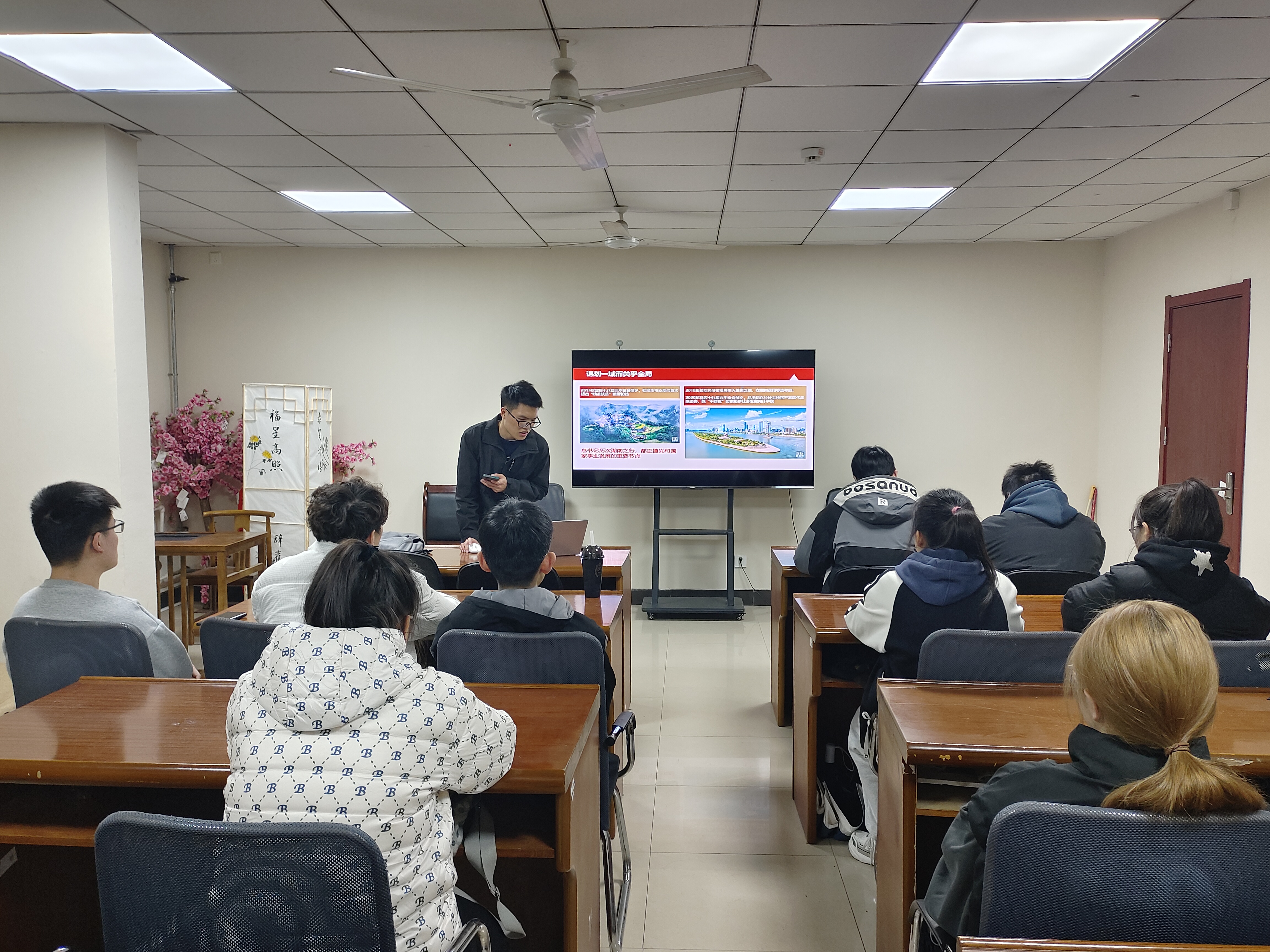 活动伊始,黄旭兴说明了全国两会的基本知识,重点讲述了新质生产力的提出和发展。他详尽介绍了习近平总书记的湖南之行,通过举例湖南第一师范大学“千年学府,百年师范”的校训告诫同学们要赓续红色血脉,担当时代重任。接着,黄旭兴讲述了中外合力打造创新创造新局面的首要途径,因地制宜实现新质生产力的迅速发展,不断扩大高水平对外开放。最后,黄旭兴针对同学们当下的发展阶段提出嘱托,鼓励同学们立锥学业,锐意进取。