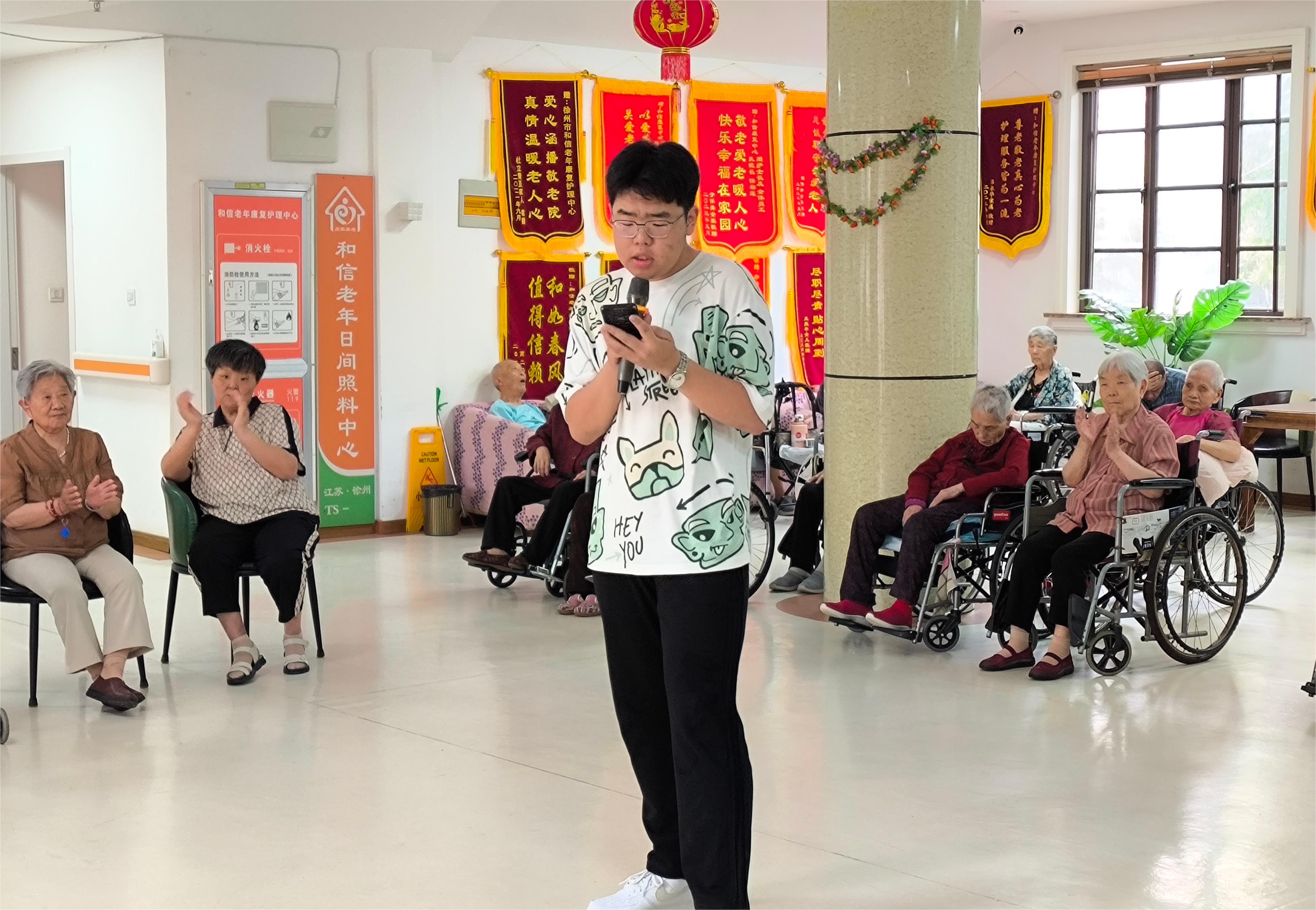 活动期间,同学们怀揣着温暖与关怀走进了和信敬老院。老人们看到同学们的到来,脸上也洋溢起幸福的笑容。随后,同学们与老人聊天、解闷,并带领老人们做一些简单有趣的小游戏,在确保安全的情况下,帮助老人活动身体。最后,同学们进行文艺表演,带动活动氛围,以歌曲缓解老人的孤独感,表达同学们的关爱与关怀。观看完同学们的表演后,老人们也活跃起来,现场欢笑声音不断。