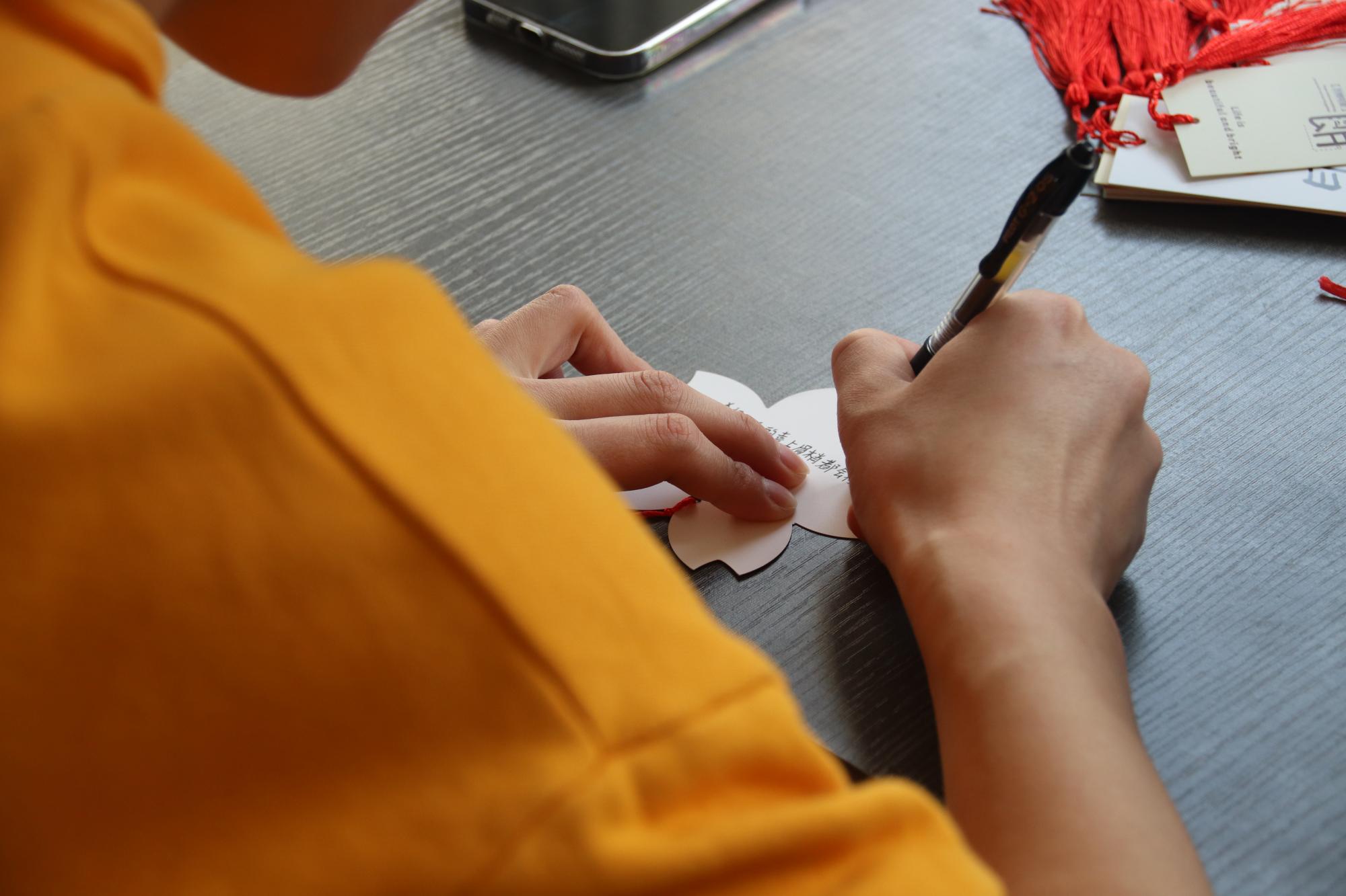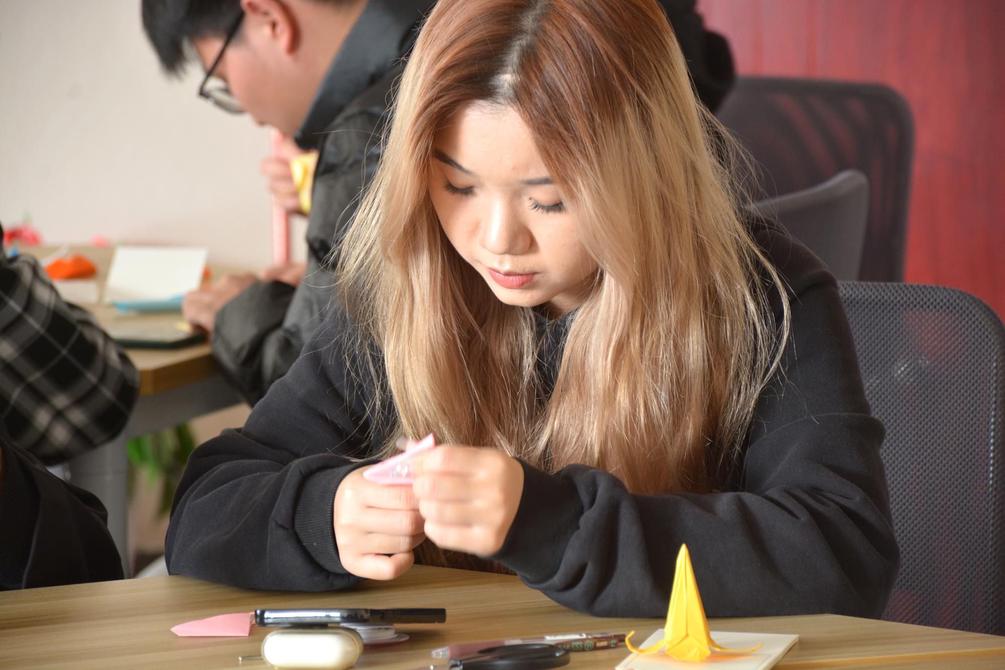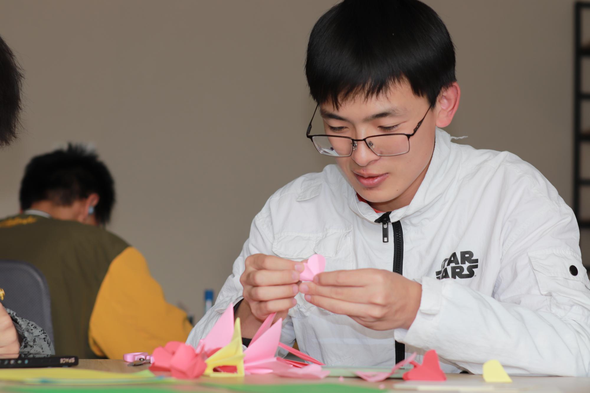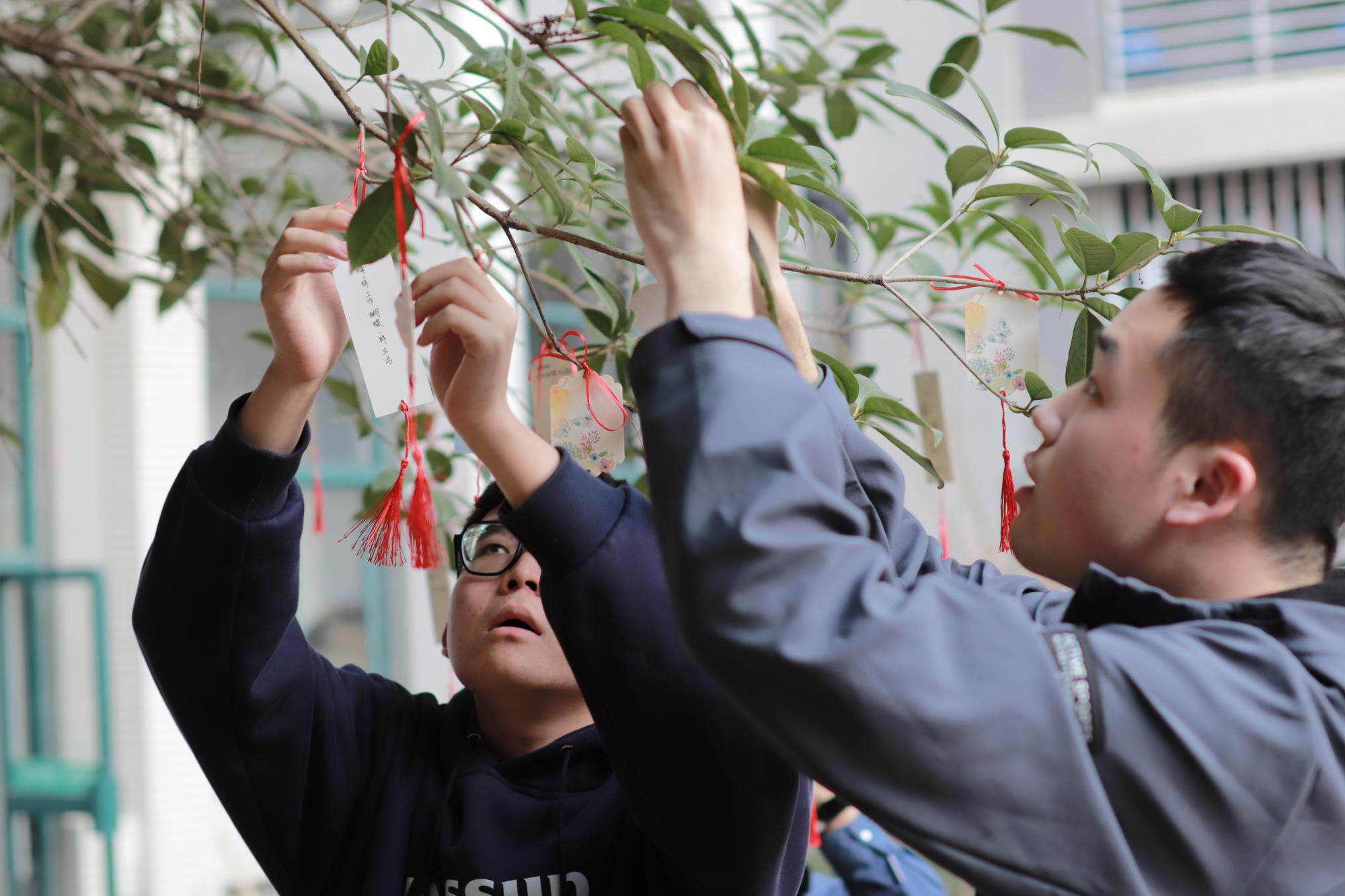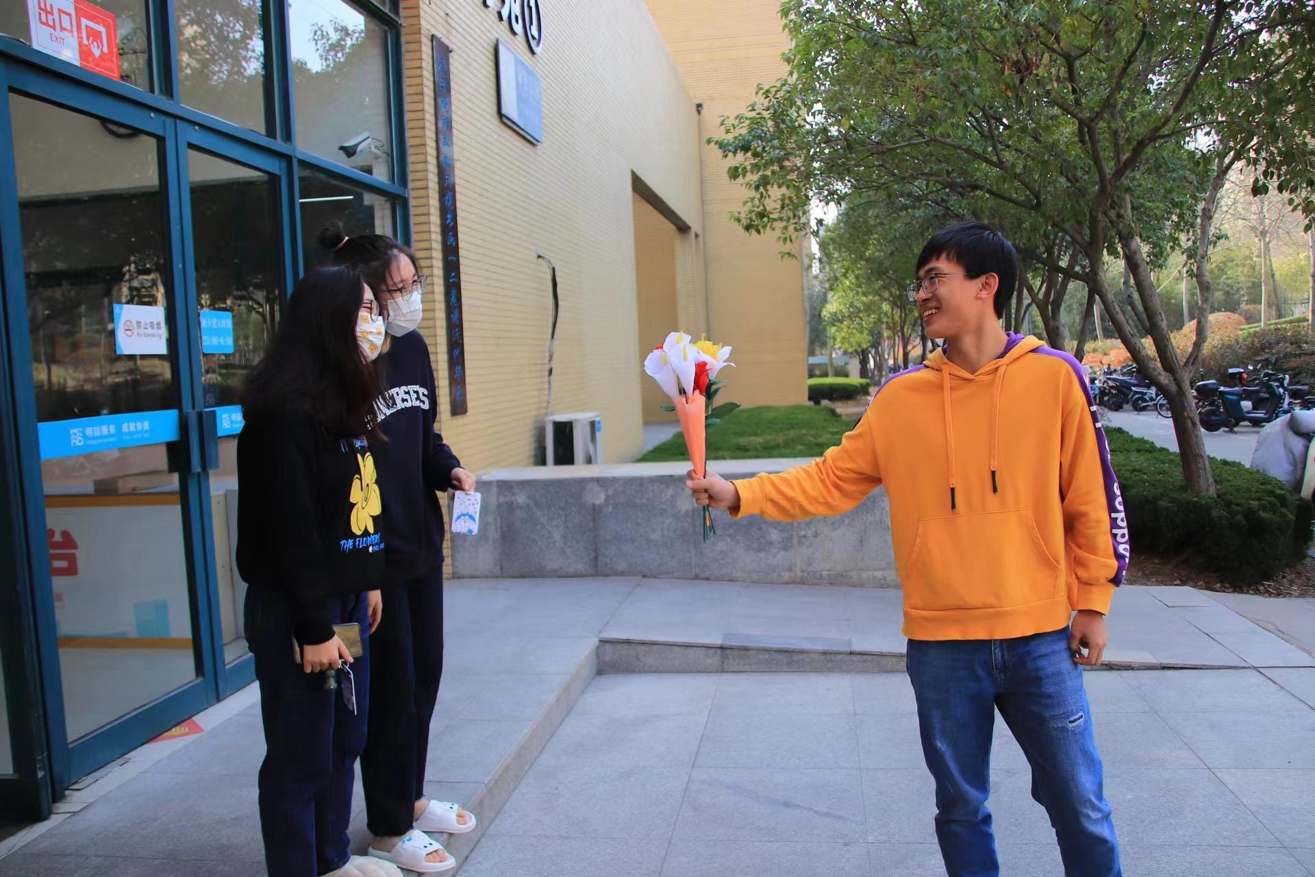 学生积极响应,同学们于梅三庭院和书吧登记信息后,扫码进入活动群,挑选一张自己喜爱的卡片,亲笔写下对女生真挚的祝福语句,并跟随志愿者一同将明信片挂满已泛春意的枝头,以此为女生们献上真挚的节日祝愿。树梢上的一张张卡片在阳光下格外温馨耀眼,这为男生女生提供一个相互交流的平台,更让每一个女生在这个属于自己的节日里拥有一个美好的回忆。除了制作精美卡片外,同学们于行健书院力行轩进行折纸活动,他们各自交流经验,观看学习视频,制作出各色各样、种类繁多精美的折纸礼物。大家将心中的祝福化作美好的语句和一朵朵美丽的纸花,表达了对女性最美好、最衷心的祝愿。