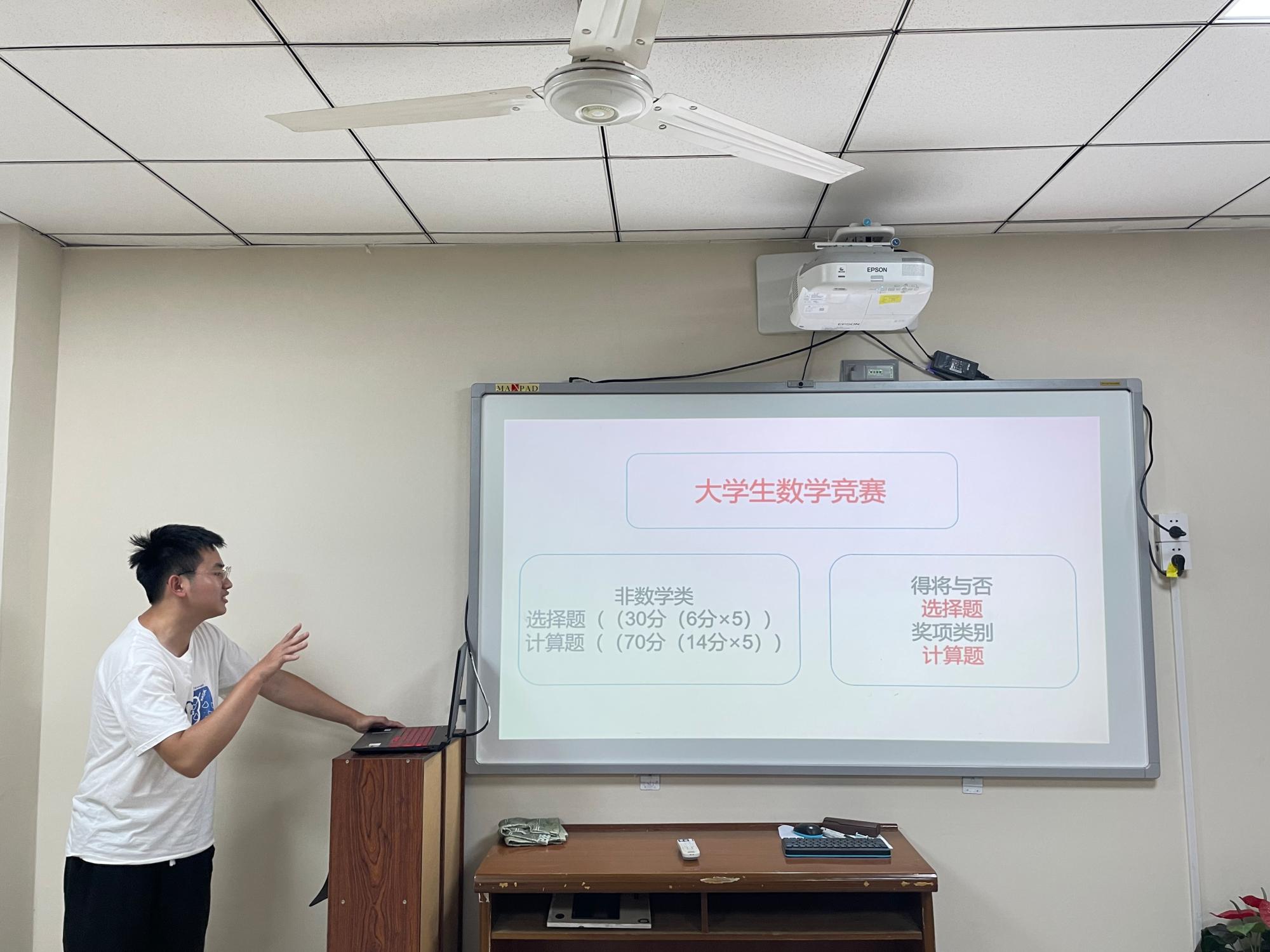 首先,曹蕾同学讲解了初赛、决赛的具体时间,建议同学们合理规划复习时间,尽量避免与课程考试冲突。其次,她向同学们展示了历年竞赛真题,让大家对试题难度有了初步的了解。曹蕾表示数学竞赛一年一次,十分难得,希望同学们能抓住来之不易的机会,走出舒适区从而挑战自己。接着,毛紫浩同学为大家介绍了竞赛试题结构以及自己备赛时的经历。通过与其他各个大型数学竞赛的对比,他认为本次竞赛难度大、涉及范围广,需要同学们夯实基础、强化数学思想。最后,毛紫浩为同学们讲述了他的做题技巧以及经验,并列举典型题目作为难度参考,让同学们全面具体地了解了数学竞赛相关内容。