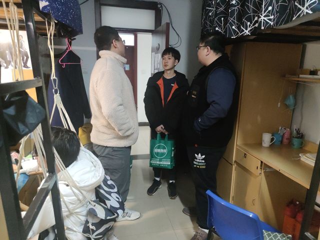 学工办主任刘世通、2017级辅导员杨涛走进学生寝室,为考研学生送上祝福和鼓励。