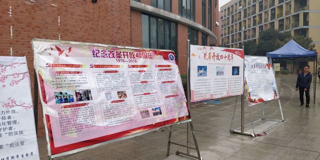 知行社的工作人员在二食堂广场集合完毕,并对活动区域进行了仔细的布置。布置完毕后,活动正式开始。首先,由理论学习部和各理论学习类社团,将改革开放分为政治经济、民生、人文科技、展望未来四个板块,进行主馆的布置。随后,相关部门及社团通过自己制作的展板、照片、影像资料等回顾改革开放发展历程,通过今昔对比认识到改革开放带来的成果及意义。接着,进行互动展示,各展馆自行设置小游戏互动环节,并通过游戏互动获得相应印章,得到的印章可到指定地点兑换奖品一份。最后,进行成果展示,各参赛小组将作品在青春广场进行展出。