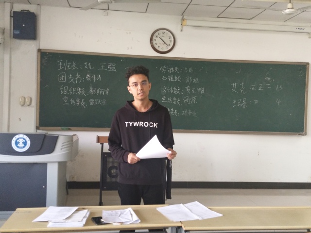 上午10点,班会准时开始。上一任班长艾克充分肯定了过去一年班委们的辛勤工作,并对新一届班委提出了更高的要求,同时对同学们上一学年的表现进行了评价,希望同学们在接下来的时间里找好定位,更加努力,并且艾克总结了上学期班级获得的集体荣誉,对自己做的不够完善的方面进行反省,鼓励全班同学积极踊跃地参与班委选举,为班级尽一份力。随后,由艾克组织进行了新一学年的班委换届选举。选举流程清晰透明,各个候选人也为此做了充分的准备,依次上台发表了竞选演讲,积极介绍自己,展望未来应尽之责,台下各位同学也认真思考,为手中的选票负责。在激烈的竞争后,班级成员通过无记名投票选出了新一届班委。