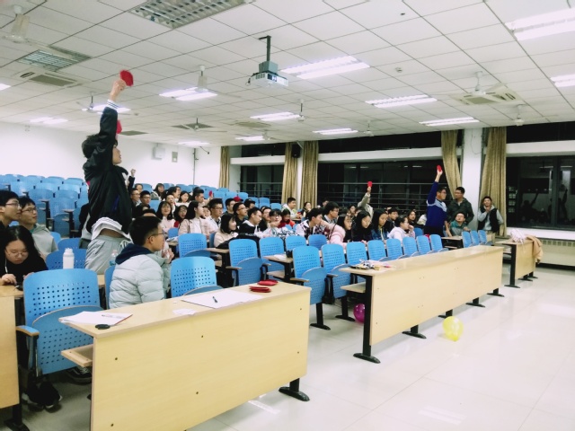晚上7点,活动正式开始。 本次比赛共分为猜歌名、接歌词、歌词接龙、换词填唱、你画我猜五个环节。其中猜歌名、接歌词、歌词接龙环节采用抢答的方式,换词填唱、你画我猜为必答题。在比赛中,同学们反应迅速,积极抢答,到了你画我猜环节,同学们更是充分发挥了自己的肢体语言和想象能力。