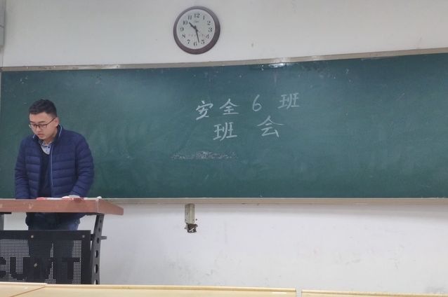 上午10时,班长袁满上台开始主持班会。他先向班级同学们详细讲述了何为优良学风班,如何建设优良学风班级,以及优良学风班的评比细则。袁满提到,选择建设优良学风班的目的在于提高班级整体的学习状态,希望大家在建设的过程中互帮互助,共同前进。随后,班长对班级前期开展的一系列工作活动进行了总结,并对上课状态、考试成绩、晚点名出席率等方面提出进一步的要求。随后,班长又给同学们陈列出班委们商讨出来的班规,并将文件发到群里,让同学们进行详尽认真地阅读。最后,为了不出现边缘化人群,让所有人都能参与到班级活动中,提高班级的凝聚力,班长设置了全班的值日制度。同学们在班长讲完后,纷纷提出了自己的疑问和建议,大家的主动性很高,开展了激烈讨论,为班上制度的完善都贡献自己的一份力。同时,班主任周红星也为同学们提供了宝贵的建议,向班上所有人讲述了大学四年该做什么、该怎么做计划、如何寻找自己的方向、如何坚定的实现自我目标等有助于同学们成长发展的经验。