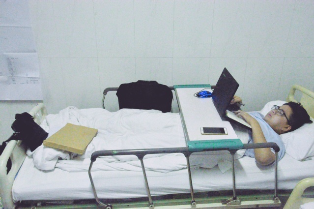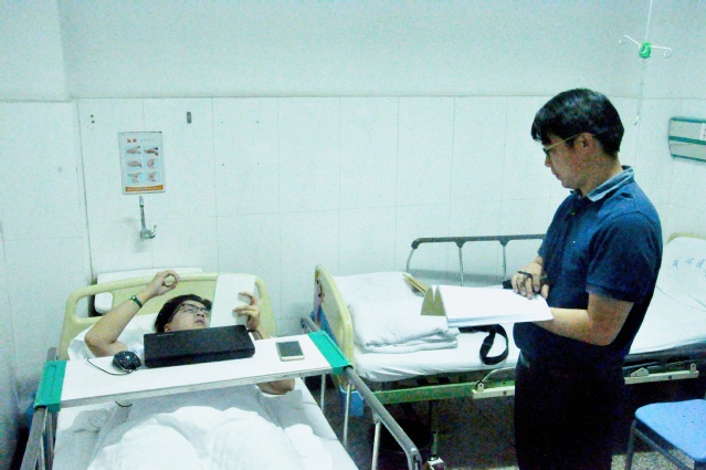 答辩委员会批准,在徐州第四人民医院的大力支持下,在医院病房为赵云举行毕业设计答辩。躺在病床上的赵云同学分别从设计的选题、国内外研究背景、实验方法和结果、创新点等几方面进行阐述,参加答辩的老师对设计中的相关问题进行提问,并对设计中的不足提出了建议。