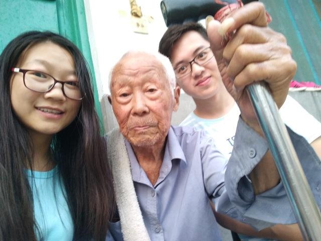 下午三时许,志愿者到达姚兆良老前辈的家中。姚老前辈今年已有93岁高龄,于1944年入伍,当时的他仅有16岁,因为个子太小所以进入流动队伍。老前辈在部队时先后参加淮海战役和渡江战役,他说:“二战时候,我是三连长,交给其他部队带走了,56年,淮海战役就开始了,徐州起点,打了45天还是55天,消灭国民党56万人,全部埋到了地耗里,彼此都能看见,还能听见声音。淮海战役把日本60多万人都消灭了,真的消灭了。接着就准备渡江战役了,我们用小木船过的江。我们十天走了1800里路,先到杭州后到上海,说杭州人早就解放了,我们又回头到上海去,后来去海岩守着。”在这之后老前辈也参加了抗美援朝战争,被国家偷偷运过去,总共打了五战,老前辈所在部队损失极大。采访结束,老前辈向志愿者展示自己的纪念章并与志愿者亲切合影。