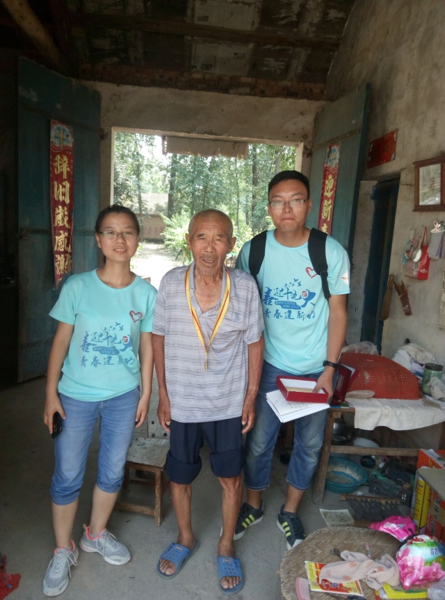 上午九时许,志愿者们来到高西忠老前辈的家中。高老前辈今年已有90岁高龄,但仍比较健谈。他于1943年入伍,仅有16岁,谈到当时入伍时的家庭状况,老前辈说道:“当时我家里我家里最穷了,正在经历土改,我家里8口人,父亲,母亲,我是老大,我家才8亩地,当时平均每个人3.5亩,我家八口人才八亩地,是贫农。我革命6年,白天打一天战,夜里跑一百多里路,我们打不过鬼子的武器,要是夜里不带兵跑,夜里得被人吃了。”高老前辈当时入的是陈毅部队,7师6旅4团2营5连3排7班,在部队里担任班长一职。在这期间老前辈打过好几次大战,老前辈边说边向志愿者展示自己当年被炸弹炸的留下的伤口,并向志愿者们示范当时枪的跨法和攻击方法。访谈结束,老前辈找出自己同战友们的合影,并向志愿者一一解释。活动最后,老前辈同志愿者们亲切合影。