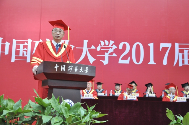 在葛世荣校长发表的精彩致辞中,他以三个平实感人的小故事引述,在寓意中寄语毕业生做有情有义的矿大人,做勤奋踏实的矿大人,做矢志报国的矿大人。他还表示,未来已来,远方不远。再过二十年,欢迎同学们重回南湖校园,观赏油菜花海,品尝镜湖鱼鲜,到那时,毕业生的成就行健天同功,真是厉害了,我的同学,我的矿大。之后本科毕业生代表、毕业研究生代表相继发表了精彩的感言,回顾了在母校的点点滴滴并且表达了对未来的无限展望与期待。教师代表寄语中,满怀着毕业生们未来美好的期盼与祝福。毕业宣誓环节中,2017届毕业生们用洪亮而坚定的声音向在座的嘉宾、老师、父母宣誓,这誓言是他们对梦想的奋斗追求、对未来的郑重承诺。