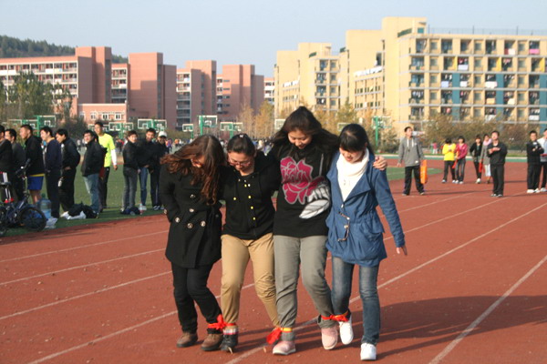 下午2点30分,参赛宿舍集合完毕,有序的签到并领取参赛编号。张鹏飞向大同学们介绍了比赛的具体项目和规则。比赛共分托球跑、四人五足、跳绳跑和定点投篮(女生为踢毽子)四项。3点左右,比赛正式开始,本次活动有四个环节,首先进行的是“四人五足”。 随着裁判员的一声哨响,四个人肩并着肩喊着“一二一”的口号,步伐越来越快。这是一项考验队员默契程度的比赛,在比赛中,有的队伍整齐化一、健步如飞,有的队伍有些不协调,甚至还在比赛中受了伤。50米结束后参赛队员与早已等在另一端的同学击掌,第二环节“托球跑”开始。参加这个环节的同学们极尽自己手上的平衡力,带着球飞奔至终点并且再一次击掌。在随后进行的“跳绳跑”比赛、男生定点投篮和女生踢毽子中,各参赛队伍密切配合,奋勇争先。经过近一个半小时的竞技,桃一509宿舍以用时一分钟的成绩获得了女生宿舍冠军,男生组梅二B704宿舍取得冠军,他们的成绩是一分零三秒。下午4点,活动圆满结束。
