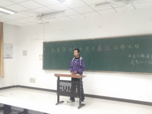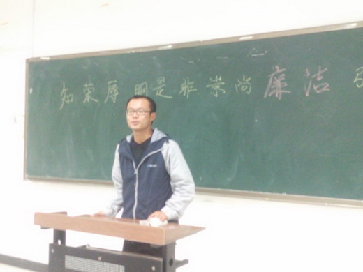 10月30日晚7:00,消防10-1班于教五C105顺利开展了以“知荣辱 明是非 崇尚廉洁”为主题的班会。我院10级辅导员李成刚老师出席此次班会。此次班会由何选择同学主持。
