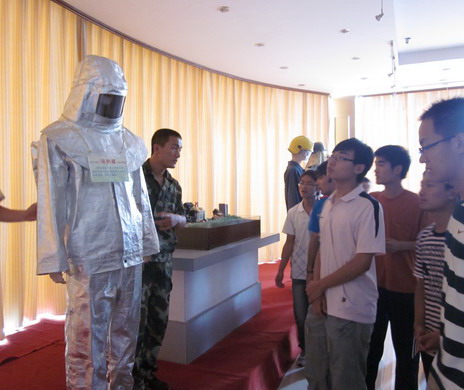 在院青协的带领下,我院10级同学再次踏入了徐州市消防支队。与去年11月份首次参观学习相比,此次同学们的心情更加激动,与坚守在那里的消防战士之间也更加亲切。同时,参观学习的程序比首次也简单了很多,先是参观了消防队的展示厅,面对能在800多摄氏度的高温下依然能为消防战士提供安全生存环境的隔热服面前,同学们不忍纷纷前去感受它的材质。防火服在1100多摄氏度的高温环境中仍能保持原有模样,使大家深刻体会到科技的力量。