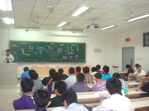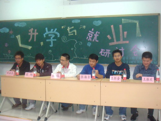 为更好地进行升学与就业方面的经验交流,2011年5月22日由我院创业协会和科技学术部共同举办的“升学与就业”研讨会于教五A201成功举行。本次研讨会邀请到了07级的刘永杰、伏旭、金侃等优秀同学作为嘉宾。交流会由何选择同学主持,我院各年级同学悉数参加。