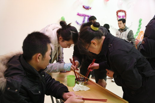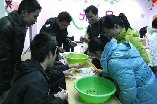 我院在元旦游艺宫中筹备了“脚下出‘踩’”、“水上浮针”、“一拍定天下”、“极速运球”等等一系列的游戏。“水上浮针”要求同学利用水的表面张力将针浮在水面上,但不幸的是,好多同学的针刚接触到水面就下沉了;“极速运球”需要同学们用筷子夹着乒乓球把它放到另一端的杯子里,虽然难度有点高,仍有很多同学顺利过关,荣获奖券;“一拍定天下”则要求用网球拍正反面反复击拍乒乓球……同学在玩游戏的过程中,相互鼓励,组织者也不时说些幽默的话语逗得大家开怀大笑。教室里大家的欢声笑语融成一片,彰显出元旦的轻松欢乐气氛。