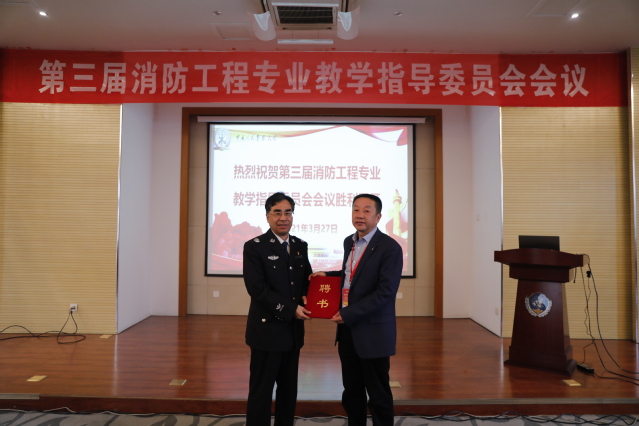 会上,常州大学校长蒋军成宣读了第三届消防工程专业教学指导委员会组成人员名单,我校当选副主任委员单位,我院程远平教授当选副主任委员,朱国庆教授和刘洪永副教授当选委员。第二届消防工程专业教学指导委员会主任委员、中国人民警察大学校长马金旗向各位委员颁发了聘书。