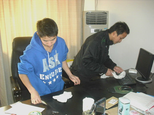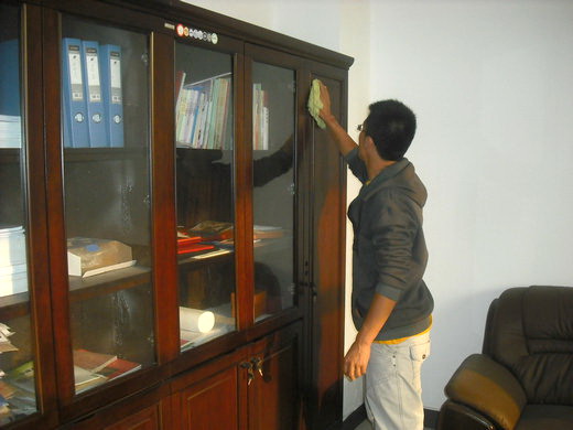 下午三点,服务分队D、E两组的成员来到我院办公楼。组长周红振和罗叶波简单的工作安排后,20余名服务分队成员两三个人一组,分散到十余个办公室。你擦桌子,我扫垃圾,大家立刻热火朝天的忙了起来。活动中,队员们一丝不苟地清扫着地面,包括每一个角落和每一处容易被忽视的地方。接着,队员们又将凌乱的桌椅摆放整齐,将办公桌上杂乱的文件和书籍归类整理。队员们不怕脏不怕累,彻底清扫卫生死角,将服务分队的奉献精神表现得淋漓尽致。安全10-3班的罗剑飞同学一直干得特别起劲,挥着一双还来不及洗的手兴奋地说:“感恩节刚刚过去,总想为老师们做些什么。像今天这样,为老师做点实事,是最有意义的!”在队员们一个多小时的努力下,办公室和会议室的面貌焕然一新,窗明几净。