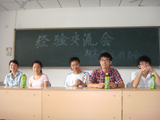 6月13日下午两点半,安全09-4班于教五C201举行了“经验交流会——期末考试动员会”。交流会由班主任唐俊老师主持,06级刘辉辉、韩文彬、张远娇、薛毅和季淮君五位同学作为嘉宾参加了此次经验交流会。