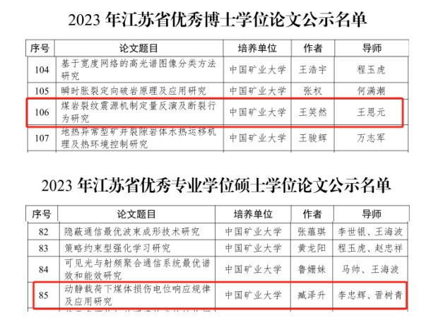 近日,江苏教育厅发布2023年江苏省优秀博士硕士学位论文评选结果公示,经培养单位初评推荐、研究生教指委复评、综合评审暨专家委员会审定等评选程序,共评出2023年江苏省优秀博士学位论文200篇、优秀学术学位硕士学位论文250篇、优秀专业学位硕士学位论文249篇。我院博士研究生王笑然(导师王恩元)的学位论文《煤岩裂纹震源机制定量反演及断裂行为研究》被评为2023年江苏省优秀博士学位论文;我院硕士研究生臧泽升(导师李忠辉)的学位论文《动静载荷下煤体损伤电位响应规律及应用研究》被评为2023年江苏省优秀专业学位硕士学位论文。