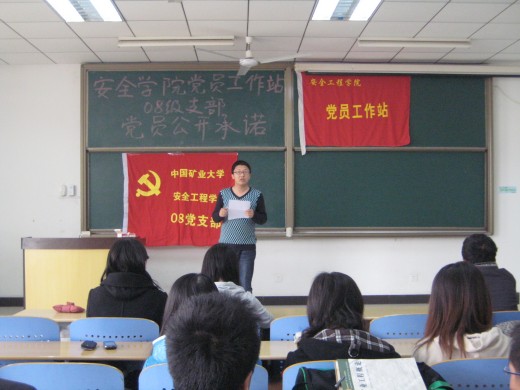 为积极创建“五好”先进基层学生党组织,切实发挥学生党员的“五带头”作用,不断推进学生支部的先进性建设,我院2008级党支部举行了隆重的公开承诺活动。此次活动于4月8日10点在教一A304正式开始,由08级党支部书记徐跃同学主持,支部全体成员以及08级全体学生参加了此次活动。
