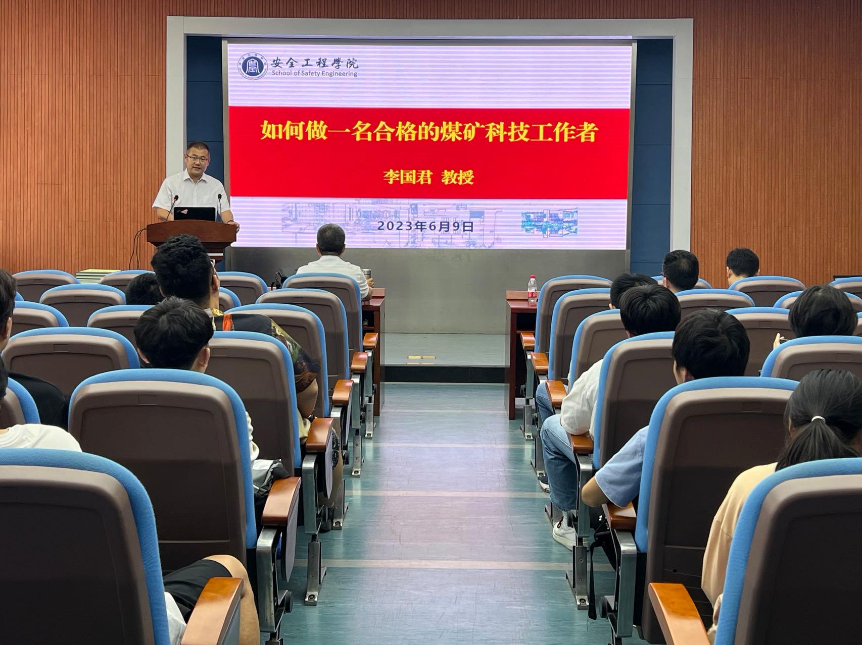 曲颂书记首先对李国君教授来做此次报告表示诚挚的谢意,在他简要介绍了李国君教授的个人经历和研究成果以后说,希望学生们珍惜这次宝贵的学习交流机会,向李国君教授虚心请教,学习李国君教授致力于煤矿科技发展的工作态度,他强调,各位同学尤其是2023届毕业生,要不忘初心,要担负起投身祖国建设的责任,最后他预祝本次学术交流会圆满成功。