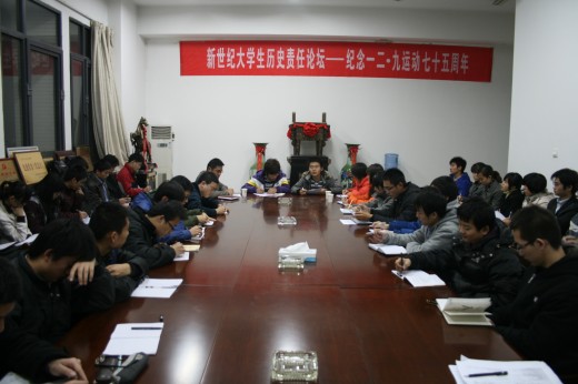 在一二·九运动七十五周年之际,为进一步激发我院学生爱国热情,培养社会使命感和责任感,12月8日晚7:00,由我院知行社主办的新世纪大学生历史责任论坛——纪念一二·九运动七十五周年于安全国产精品