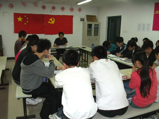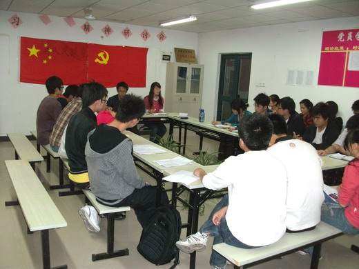 活动开始,首先由09级学生党支部书记王旭东阐述了胡锦涛主席在清华大学百年校庆上的讲话,着重强调了总书记对我们当代大学生提出的三点要求,“第一,把文化知识学习和思想品德修养紧密结合起来。第二,把创新思维和社会实践紧密结合起来。第三,把全面发展和个性发展紧密结合起来。”王旭东根据这三点要求,结合我们本身的实际,向大家提出了几点要求:明确学习的目的、树立正确的人生观和价值观、将个性发展和全面发展结合起来、处理好个人与集体的关系、珍惜时间,只争朝夕。随后学生党员就这几点进行了热烈的讨论,并进行了相互的交流。大家认为学习方面要改变以往一味的为学习而学习,为考试而学习的习惯,区别“考生”与“学生”,努力使自己成为一名“学生”而不是一名“考生”。平时学习中要学会学习的方法,思维方式。当代大学生作为社会主义建设的栋梁之才,要树立正确的人生观和价值观,对自己和周围的环境要有一个积极的影响。关于实践与创新,党员们实事求是,结合自身提出目标,把所学知识努力与实践相结合,多进行一些社会实践,然后进行创新。在个性发展与全面发展的关系上,大家认为个性发展是创新的必由之路,是个人天赋的充分发挥,我们要在全面发展的基础上彰显个性。