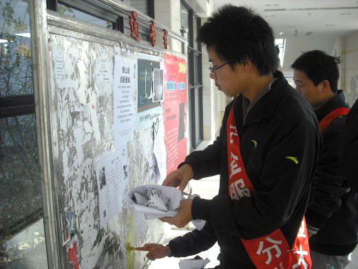 12月14日下午3:00,我院服务分队B组在公教一区,三区顺利开展了清理、擦洗公告栏的义务活动。B组组长杨成到场组织工作,B组全体组员悉数参加。