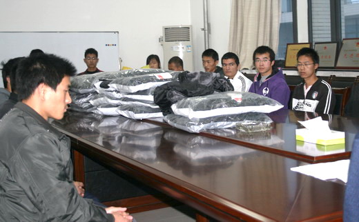 会议室集中向10级部分家庭经济特困同学发放寒衣。我院党委副书记钱雄,团委书记孙留涛老师以及辅导员刘筱婕老师和李成刚老师出席了本次寒衣发放仪式,接受寒衣补助的21名学生参加了本次仪式。