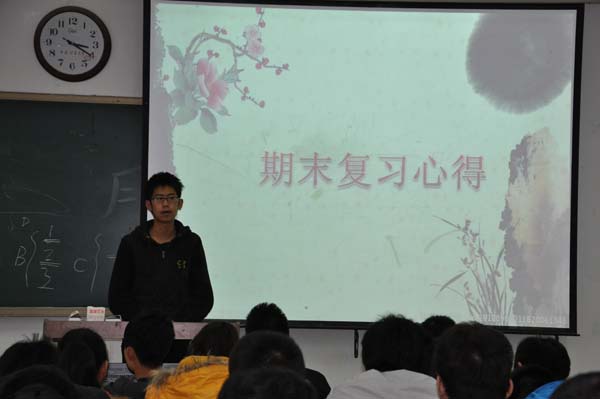 会议伊始,彭扬简单介绍了本次班会的目的,树立良好学风,冲刺英语四六级考试,加紧备战期末考试。首先进行的是四六级考试技巧交流,两位英语成绩较好的同学分别从四六级考试的写作、听力、阅读、翻译等方面给予同学们有关时间分配及答题技巧的建议。稍后,由班级中成绩较好的同学分享了期末复习心得,期末考试越来越近,班里两位比较有特点的同学分别就自身复习经历给大家讲解高分攻略与考前突击技巧。会议的最后,班主任做了简单的总结,他说,作为班主任还是很乐意参加大家的集体活动,和同学们进行交流,本次班会此次班会召开得及时、有效,给同学们带来切实的帮助,希望同学们加强学风建设,积极备考,争取在期末考试中取得一个优异的成绩。会议在热烈的掌声中也画上了圆满的句号。