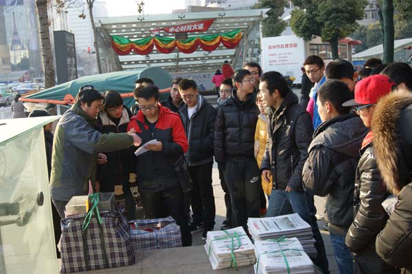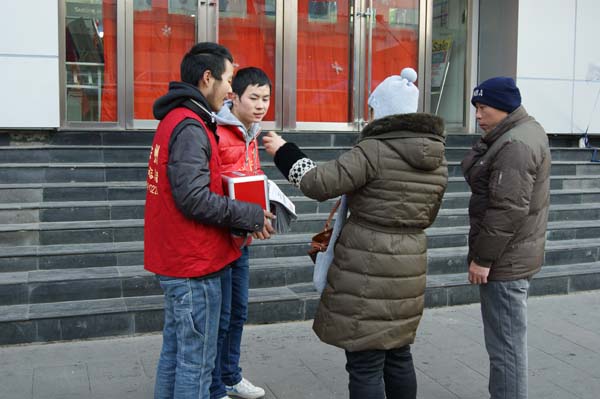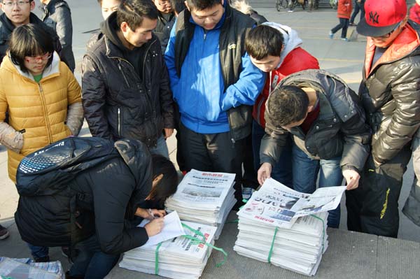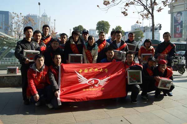 早上8:00,同学们在梅一楼下准时集合,在班长崔捷的带领下前往北门。随后乘坐公交到达古彭大厦。9:00,在领完报纸和募捐箱,并自由组合后义卖活动正式开始。同学们两个或三个一组奔走在十字路口、公交站台、商店门口等人流量大的地方,向来往的行人详细地介绍王帅一家的的情况,说服人们献出一份爱心。即使遭受到拒绝和非议,同学们仍然没有放弃每一次尝试,因为他们的每一次努力都是为了给这个家庭带去一点点希望和力量。房龄航和彭雨佳同学更是运用自己大学生的优势顺利的用英语向一位俄罗斯人说明了情况,因此他也为王帅一家献出了自己一份爱心。与此同时另一边崔捷和马振凯等同学凭借不懈努力募集了四百多元善款。12月的徐州很冷,同学们的手冻得通红,但是他们没有抱怨,并坚持义卖到中午12:00。一上午的辛苦没有白费,同学们一共卖出了420份报纸,募集善款总共3122.8元。义卖结束以后,班长崔捷带领同学来到徐州附院看望王帅及其父亲,并亲自将善款交到了王帅母亲手里,为他们带去了一份极大的鼓励和温暖。
