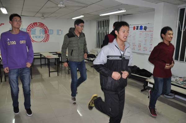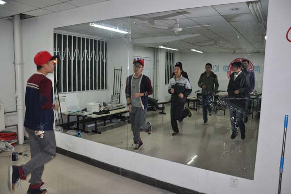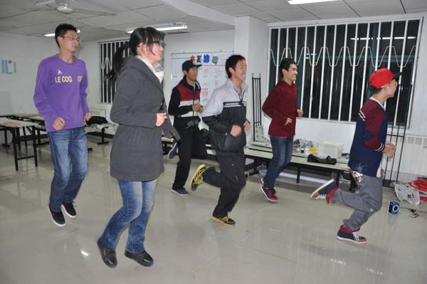 伴随着激昂的音乐,培训正式开始,首先牛壮带领所有成员进行了热身运动,经过一系列踏步,压腿的热身后,牛壮开始教大家JAZZ的基本动作,包括舞蹈动作中的手部动作,胸部动作和脚步动作,13级的成员们学习的十分认真,并在牛壮示范时对一些难懂的动作进行踊跃提问。在同学们掌握了一套连贯动作后,培训进入练习阶段,大家对着前面巨大的镜子仔细琢磨自己的每一个动作,努力的纠正自己的错误,牛壮也仔细的对同学们在练习中犯的动作错误进行纠正,并向同学们分享自己练习时的经验。虽然这些对大家来说舞蹈显得有点困难但是大家在努力中取得一点一滴的进步还是显而可见的。同学们在一次次的错误又在一次次的纠正中渐渐的也做得有模有样,大家用自己的汗水和付出为本次的舞蹈培训画上了圆满的句号。