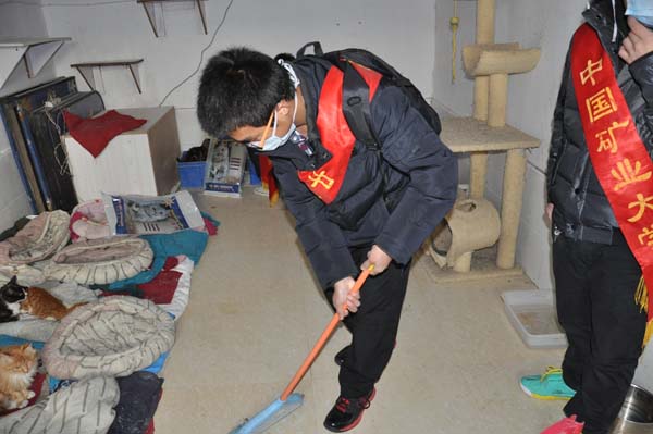 寒风料峭的早晨,微风拂面。但爱心小组的同学们却兴致高涨,他们早早地来到了小动物保护中心。工作人员黄大爷热情的招呼了来访的同学们。随后,同学们便开始为保护所志愿打扫卫生。在一群可爱的小猫小狗的簇拥下,同学们干得热火朝天,扫地、清理粪便,拖地,消毒一丝不苟。尽管这些活很脏很辛苦,但一想到这些可爱的小动物,同学们都干得格外卖力,毫无怨言。到了饭点时刻,同学们还拿出了自己准备的猫粮,给可爱的动物们喂食。看着小猫们脸上幸福的神情,同学们都感到很欣慰。
